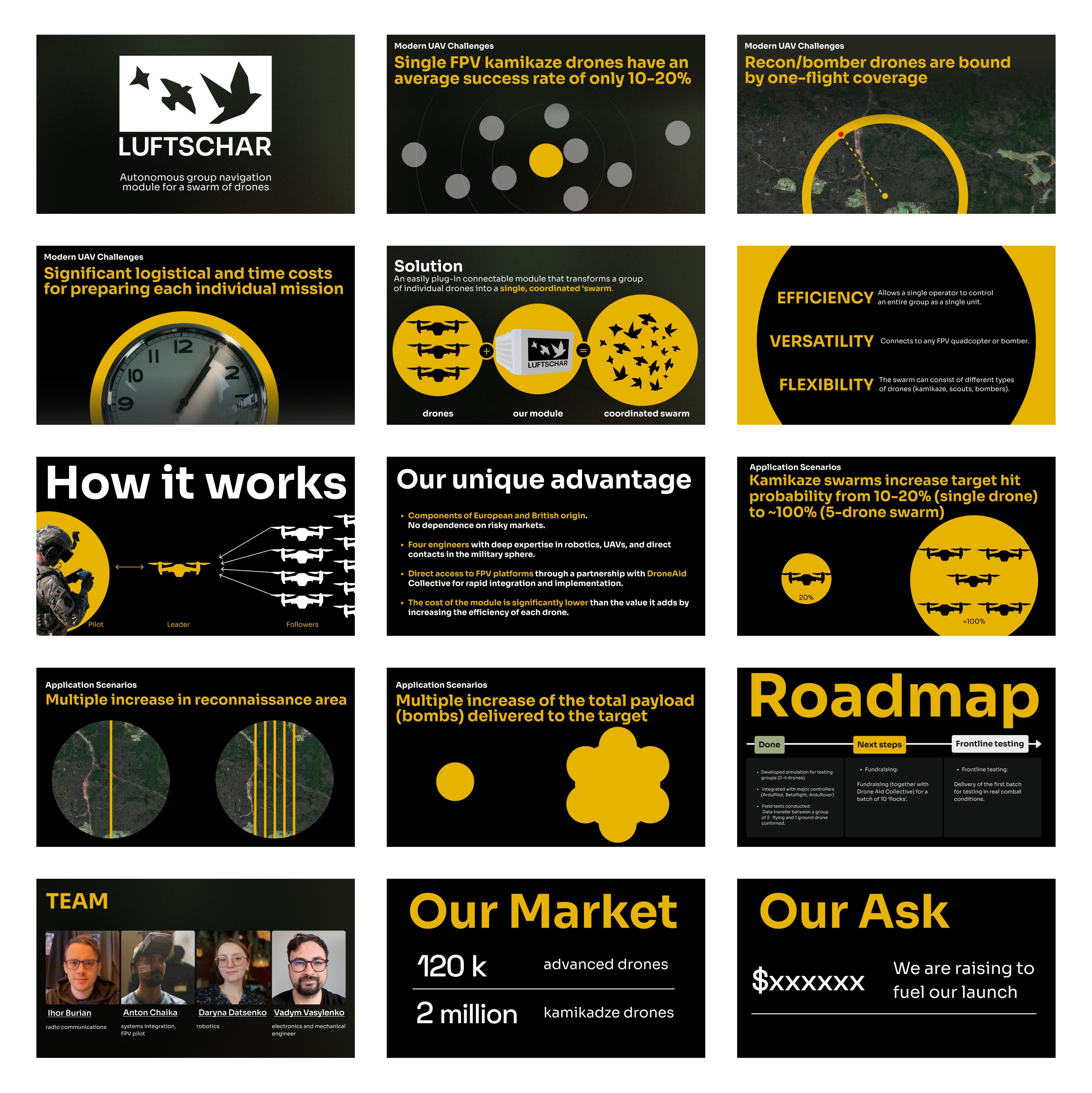 Luftschar builds camera-based autonomy modules that let one operator control multiple drones without GPS. The technology matters because GPS jamming is standard in contested environments—lose satellite signal and most quadcopters turn into expensive paperweights. Luftschar's modules use computer vision and AI guidance instead, keeping drones operational when navigation networks go dark.